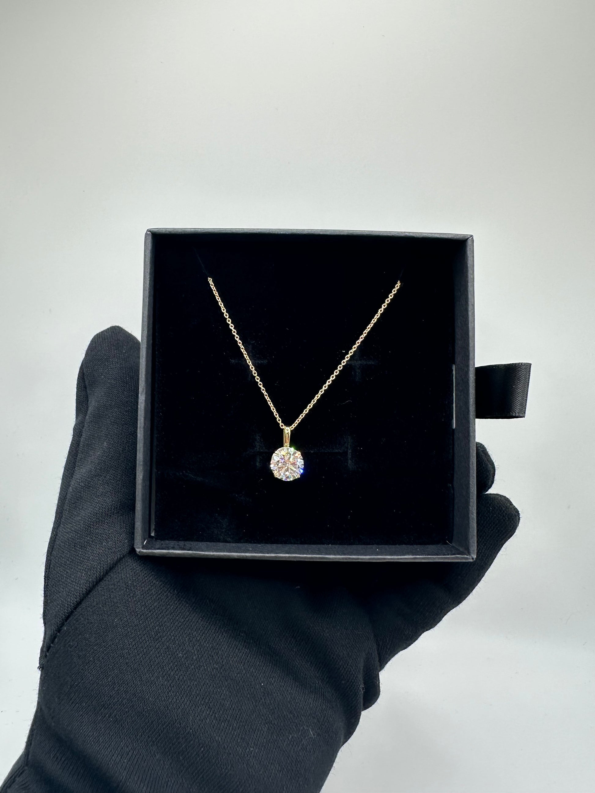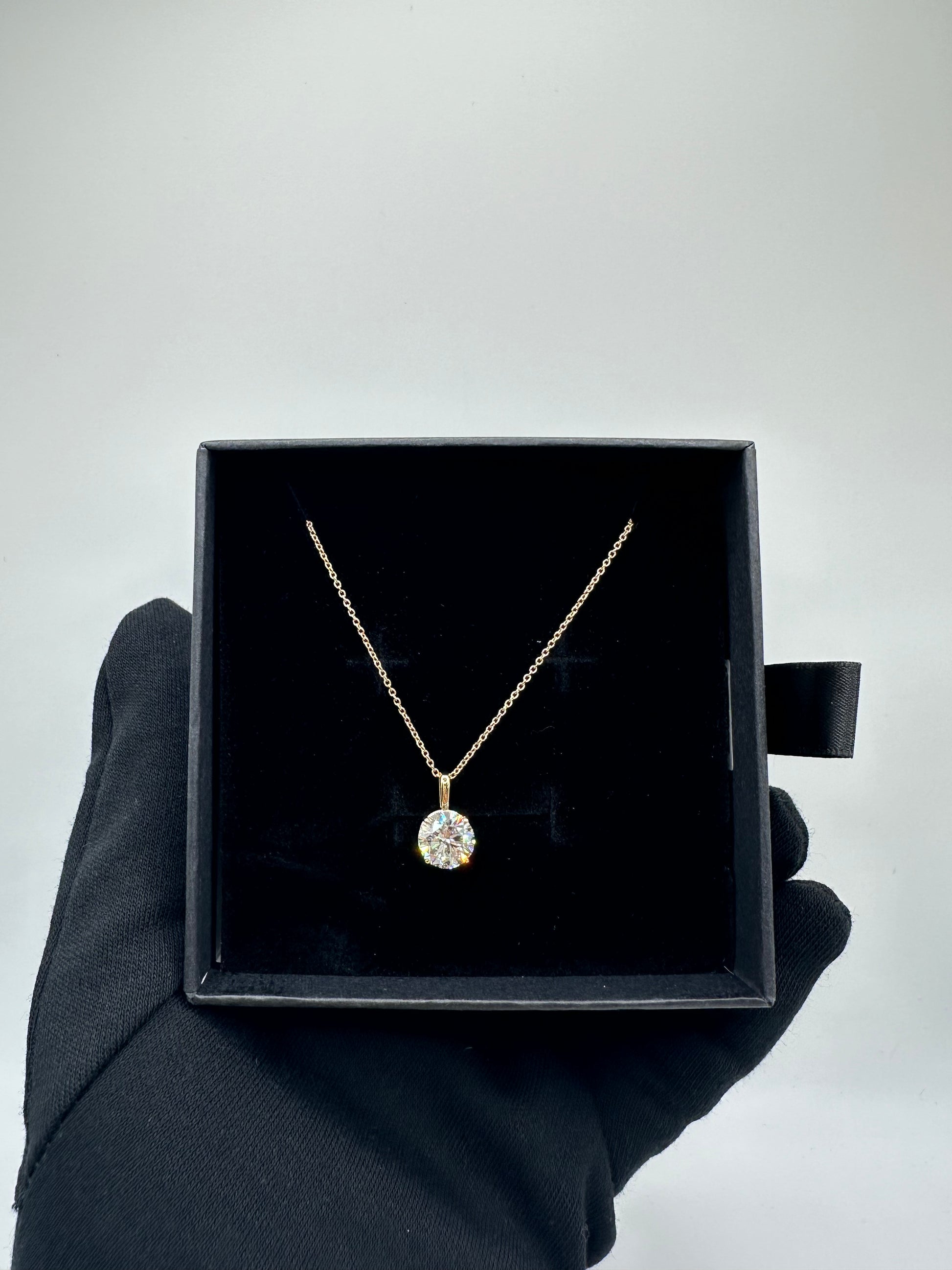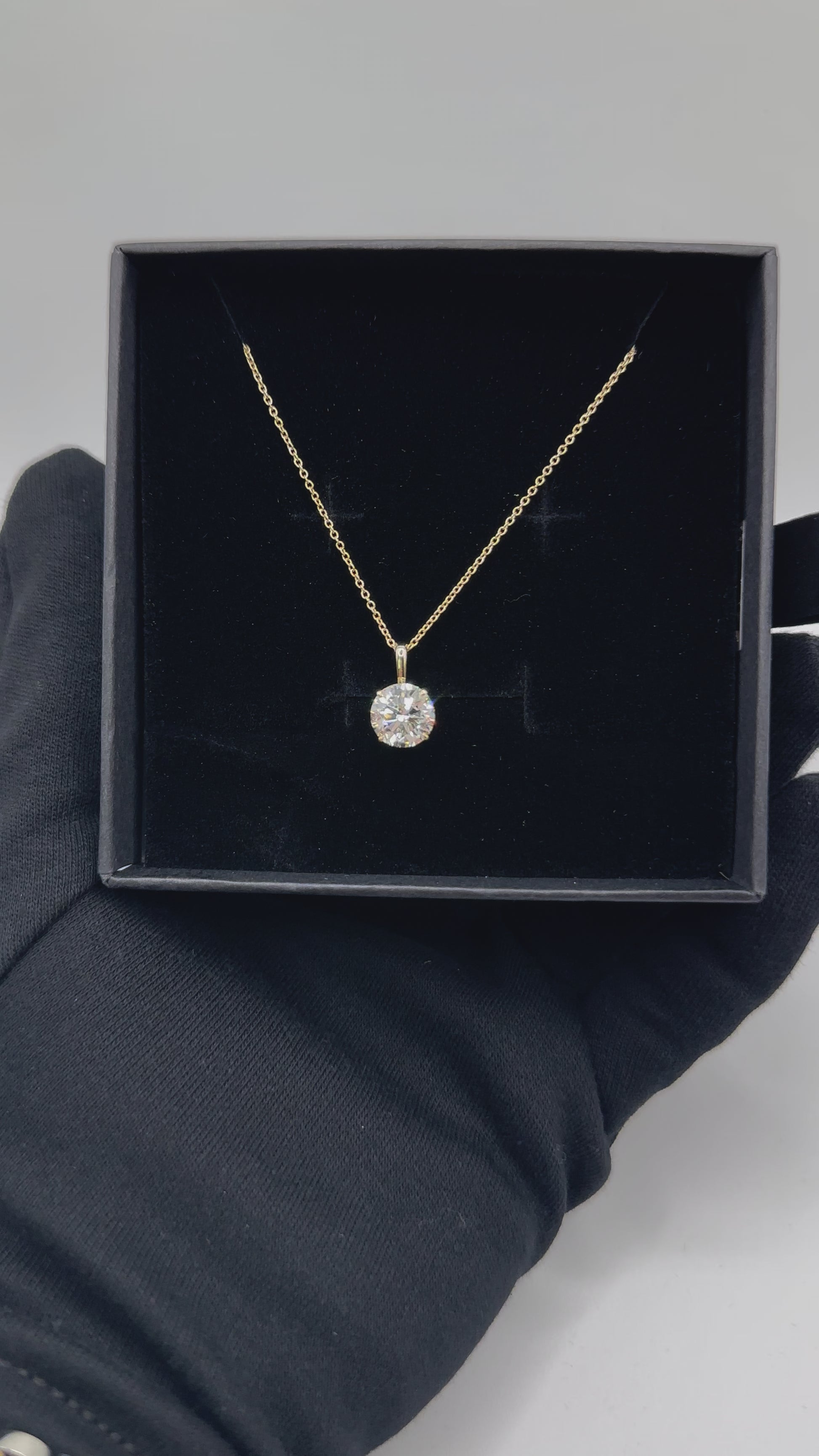 This elegant 14K yellow gold necklace showcases a 2.49-carat round brilliant lab-grown diamond pendant, secured in a classic four-prong setting with an 18 inch chain. Graded E color and VS1 clarity. A timeless piece that adds sophistication to any look.