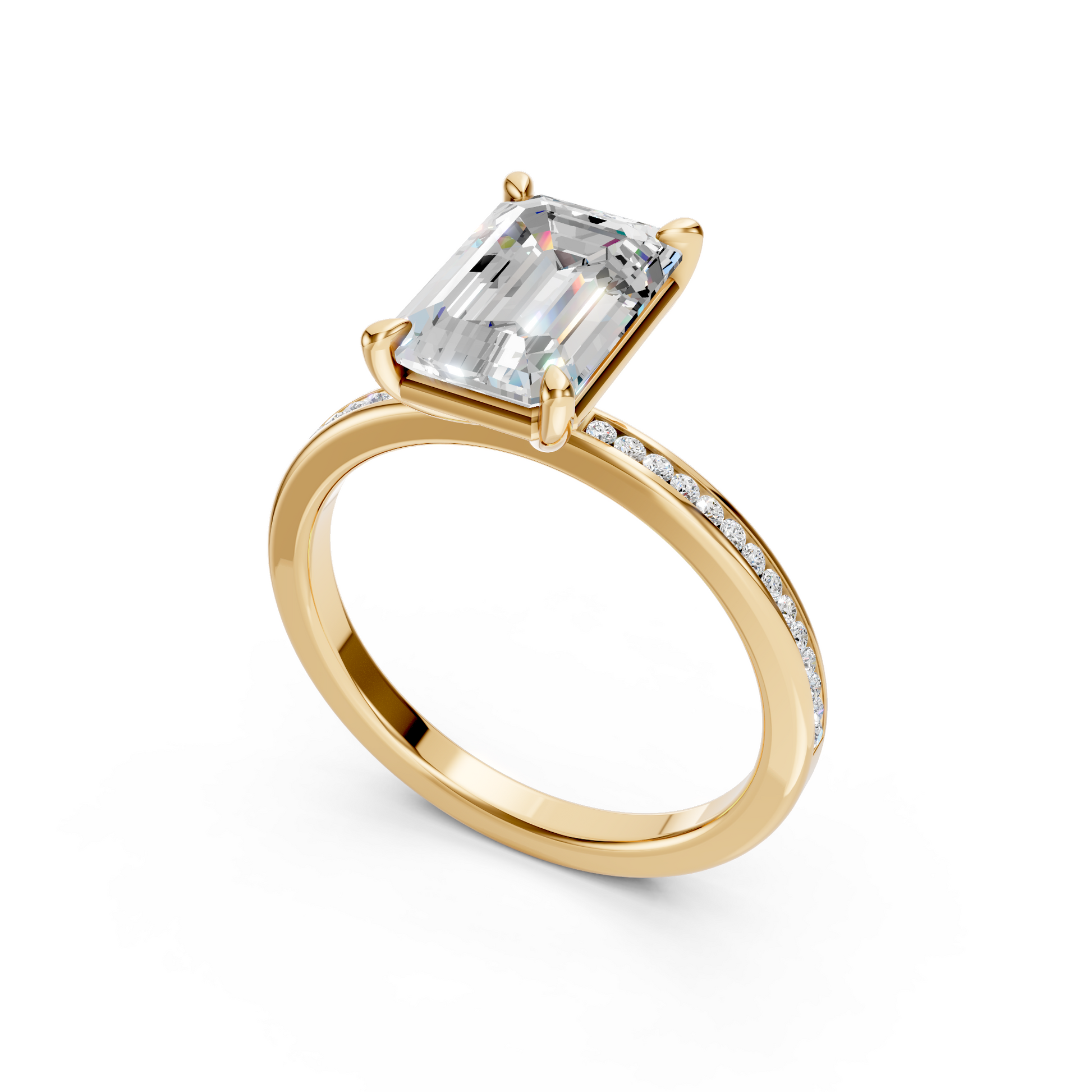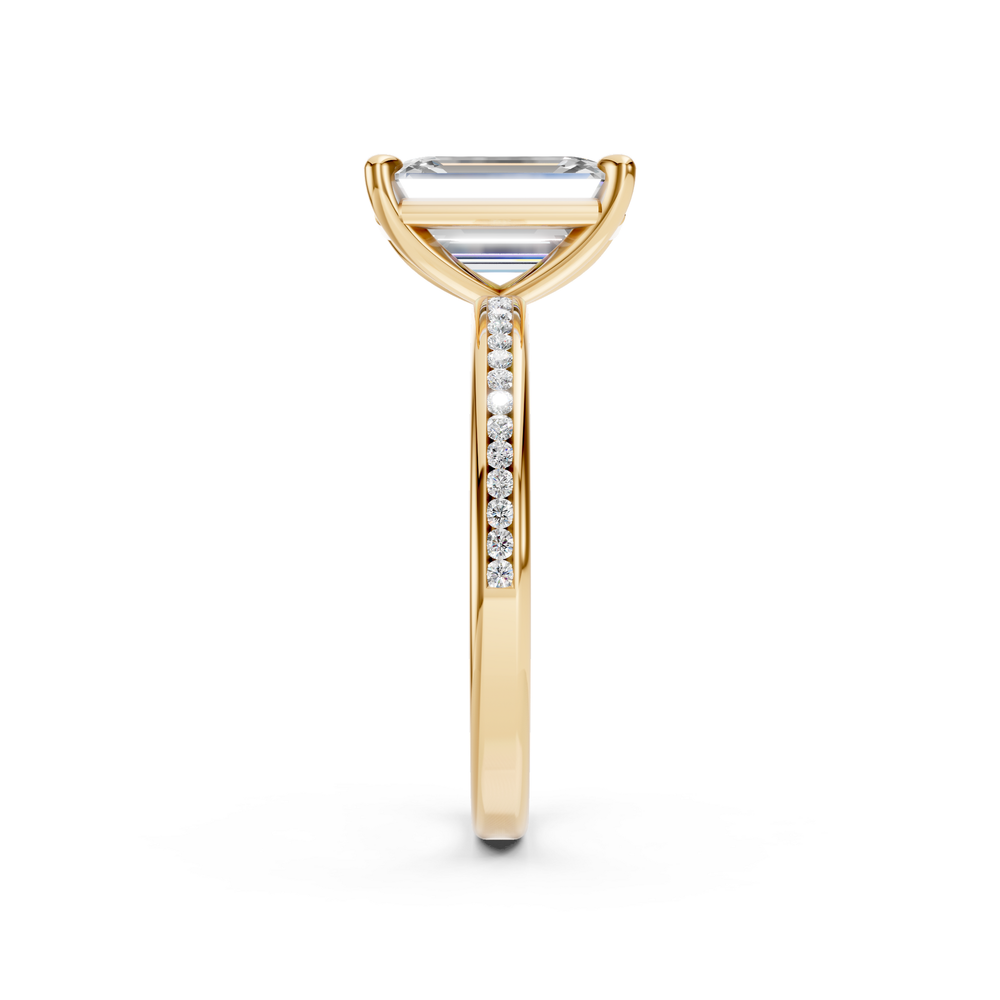 The Emerald Cut Channel Set Engagement Ring embodies timeless sophistication with a modern edge. A stunning emerald-cut diamond takes center stage, secured by four graceful prongs and flanked by a sleek, channel-set pavé band that sparkles from every angle. The clean lines and mirror-like facets of the emerald cut are perfectly complemented by the refined brilliance of the channel-set diamonds, creating a design that’s both elegant and enduring.