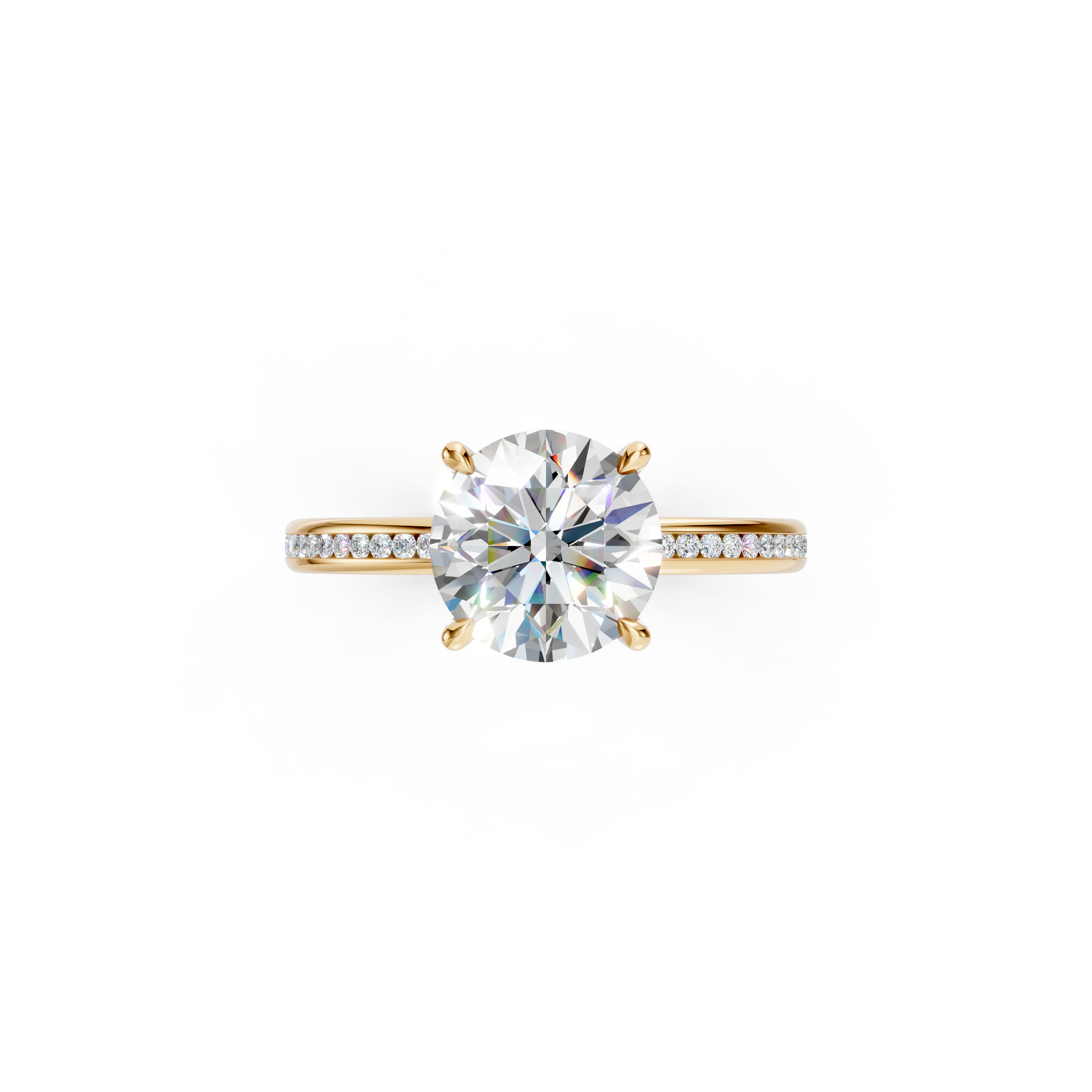 A classic four prong setting, paired with channel set pavé accent diamond band that adds refined sparkle. Set with a 3ct Round Cut Diamond, perfect for that classic and timeless engagement ring look.