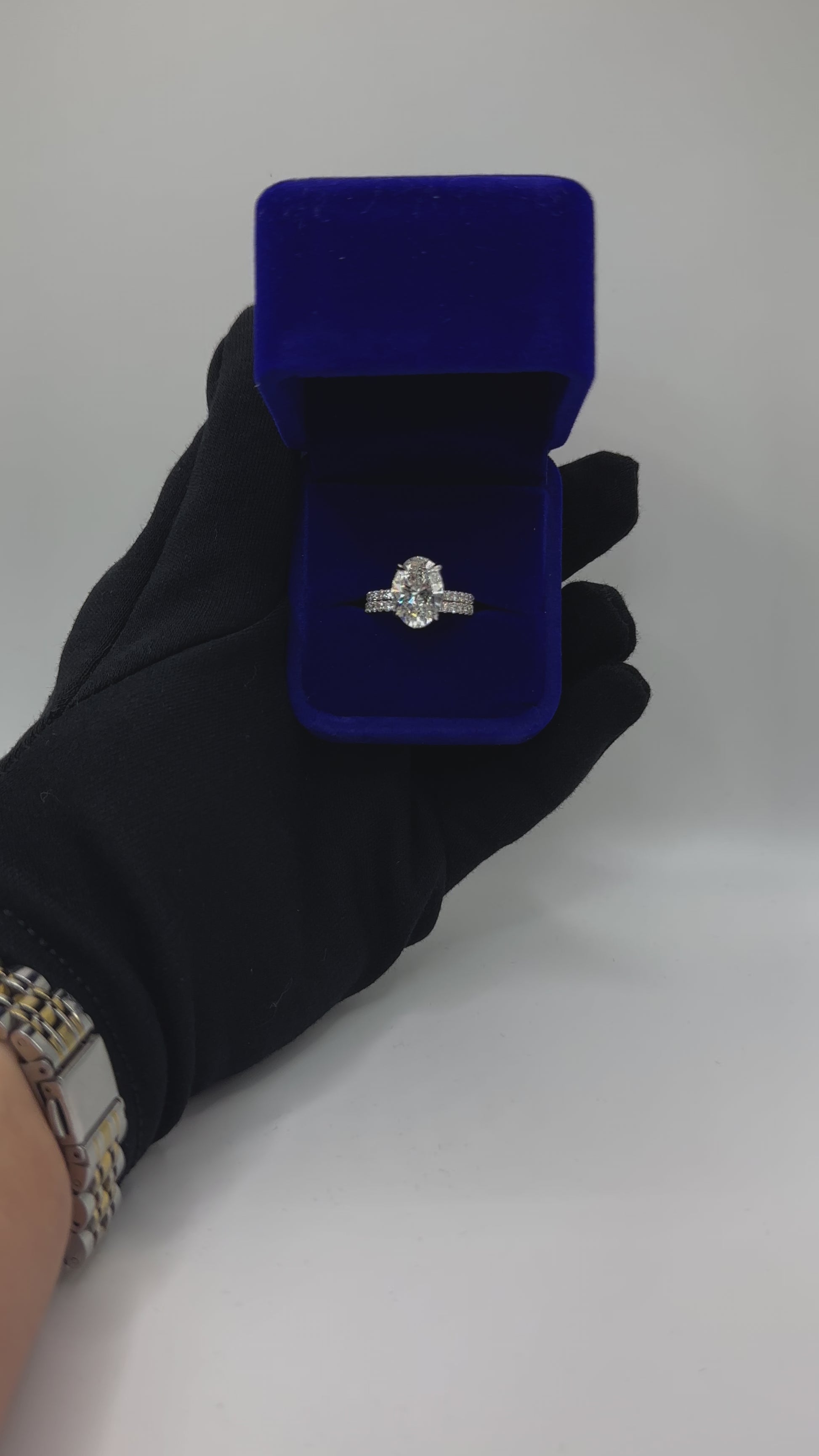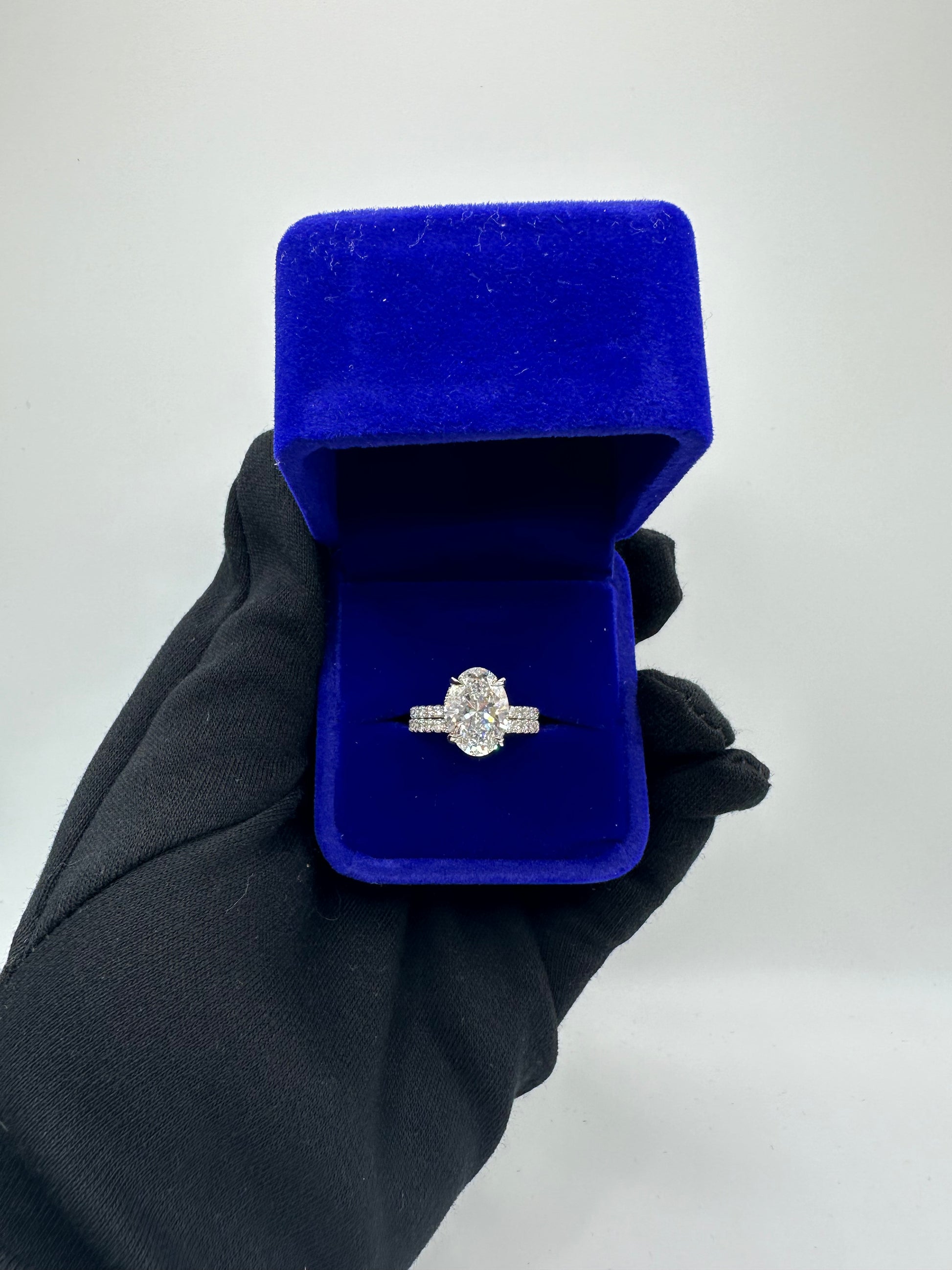 This stunning set features a 3.60-carat oval-cut diamond, F color and VS1 clarity, in 14K white gold with a hidden halo and pavé band, paired with a matching pavé wedding band. Classic and elegant.