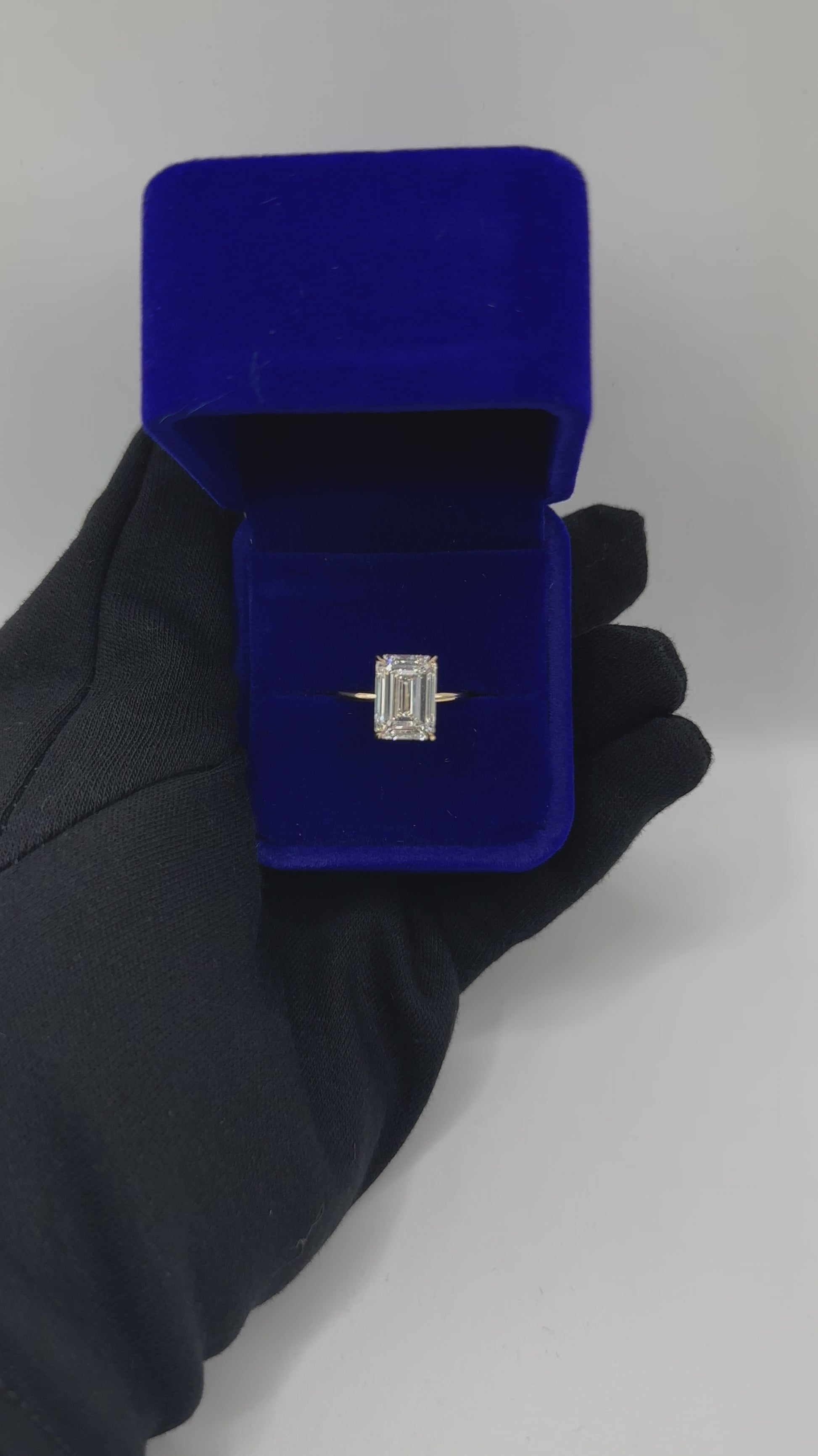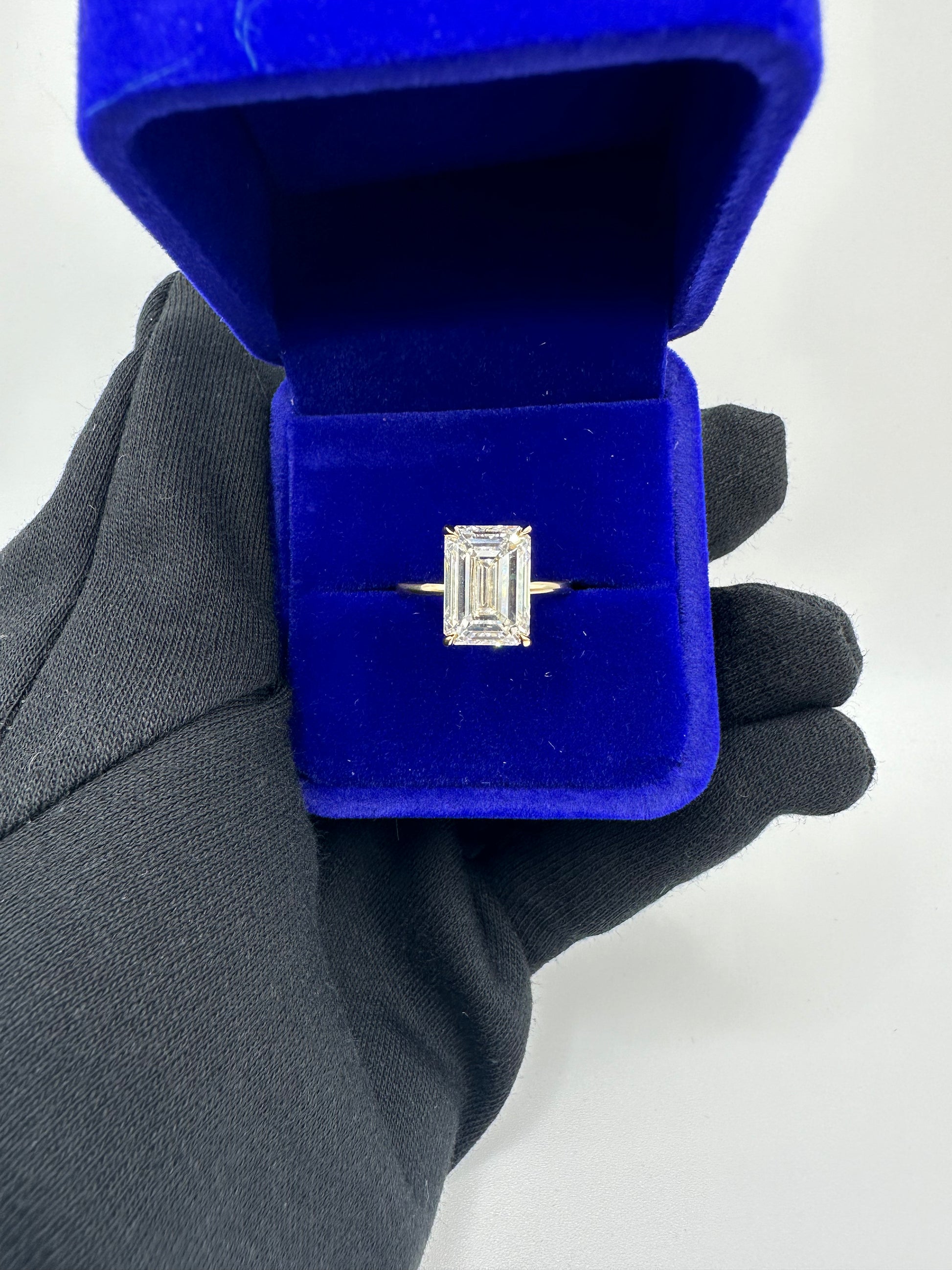 This elegant ring features a 5.07-carat emerald-cut diamond, F color and VS1 clarity, in 14K yellow gold with a hidden halo for added sparkle. A timeless and refined choice.