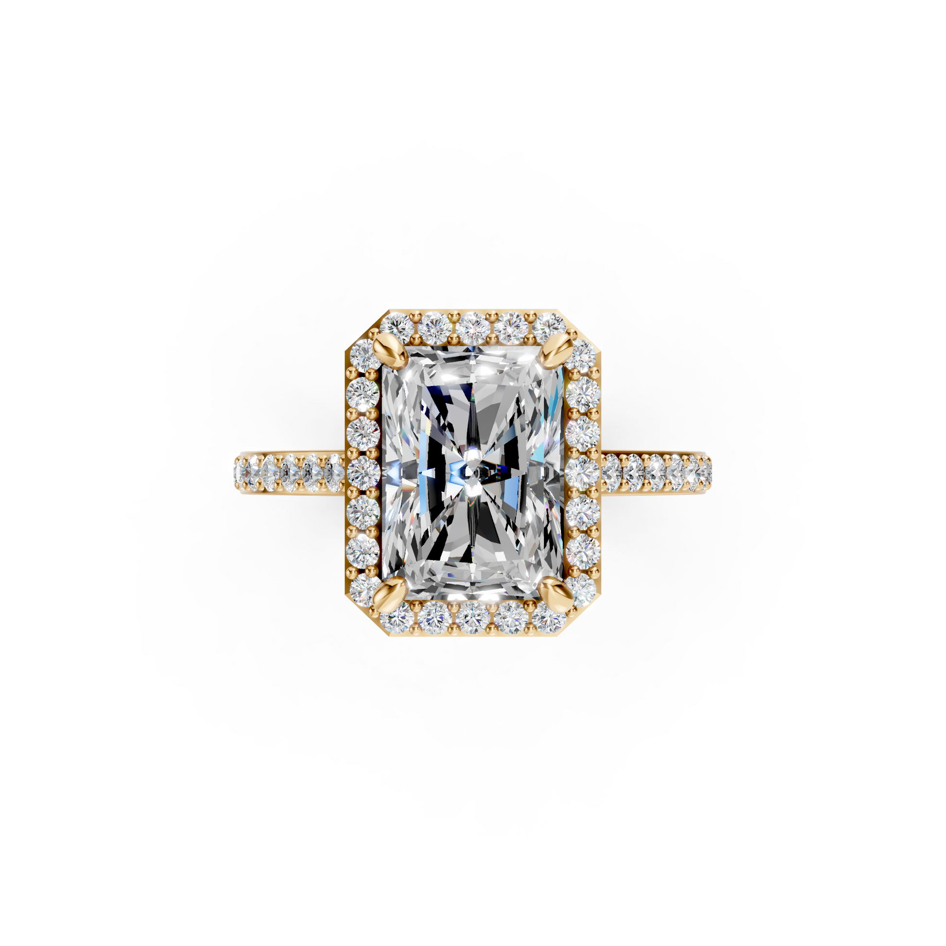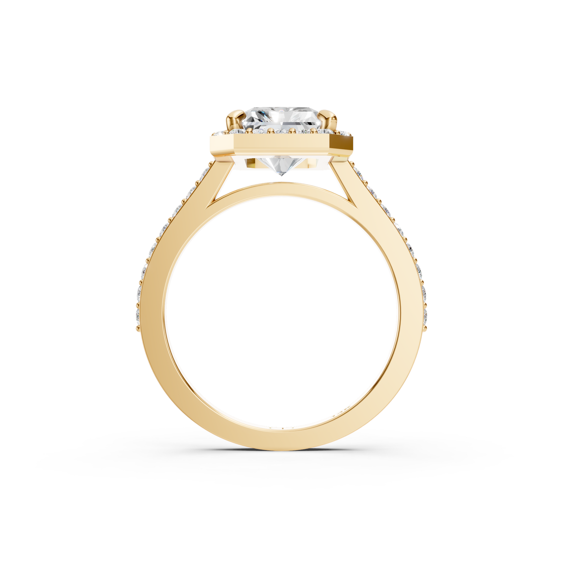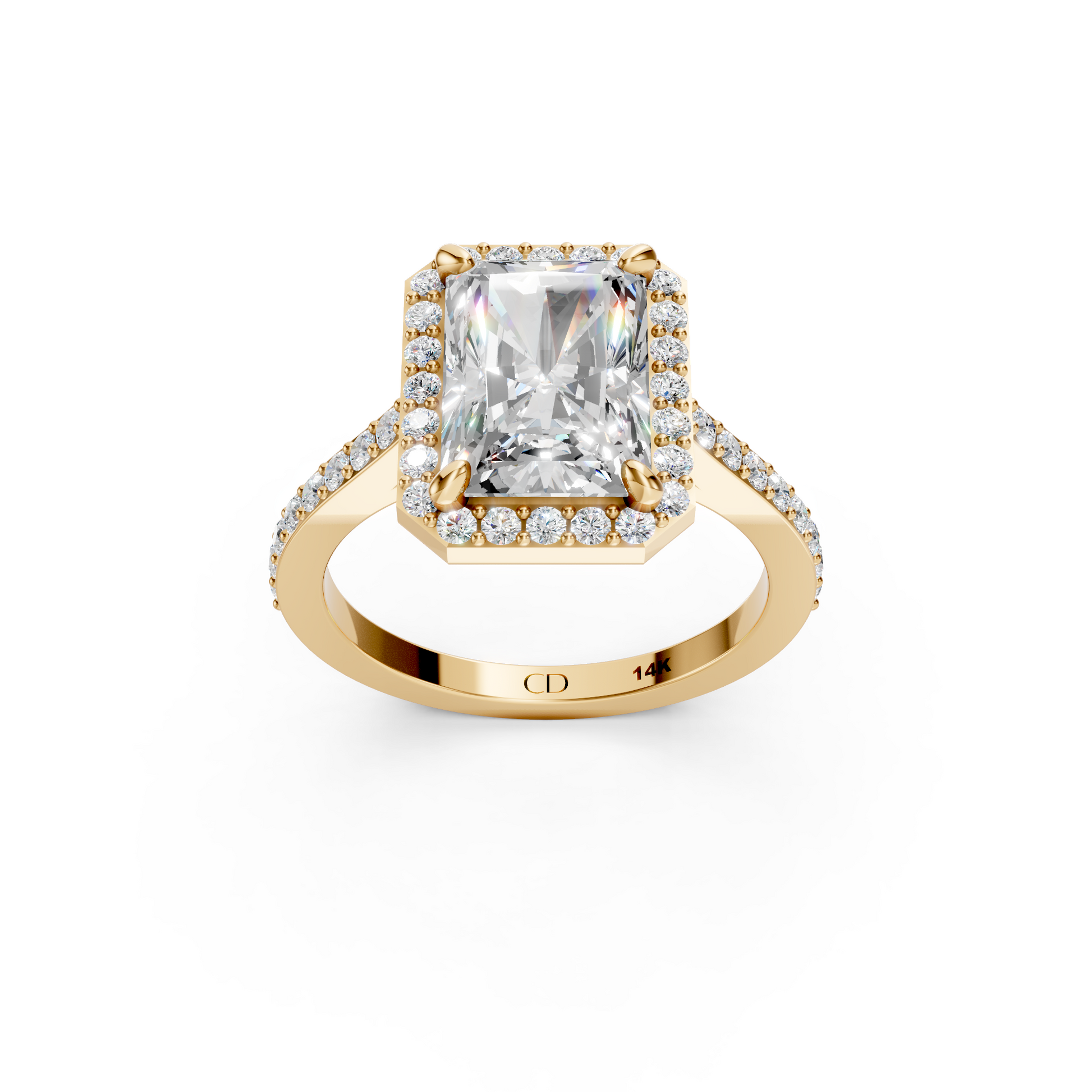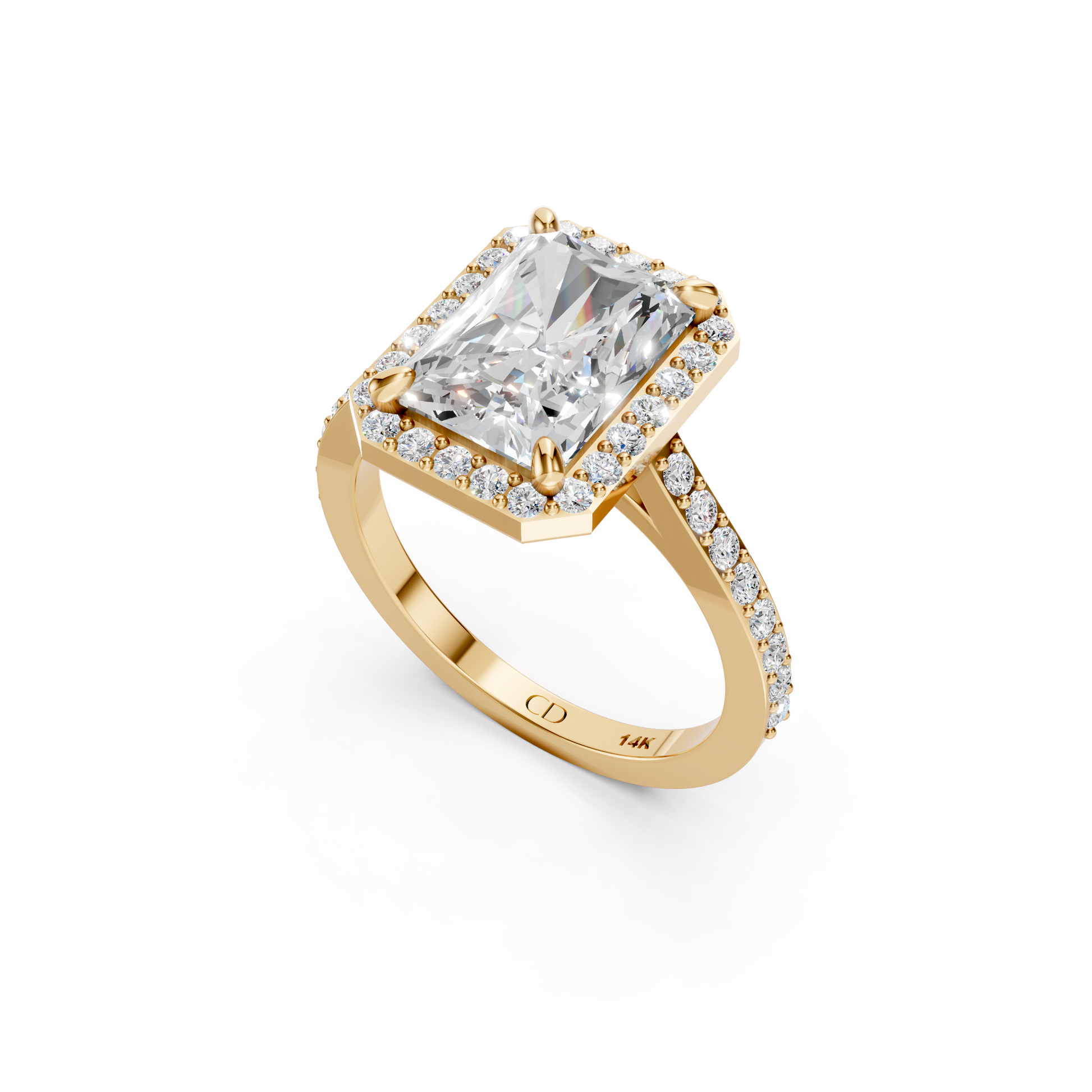 Designed for maximum sparkle, the Cathedral Halo features a radiant pavé halo paired with shimmering pavé accents along the band. The cathedral rise elevates the center stone beautifully, allowing the entire ring to catch and reflect light effortlessly.
