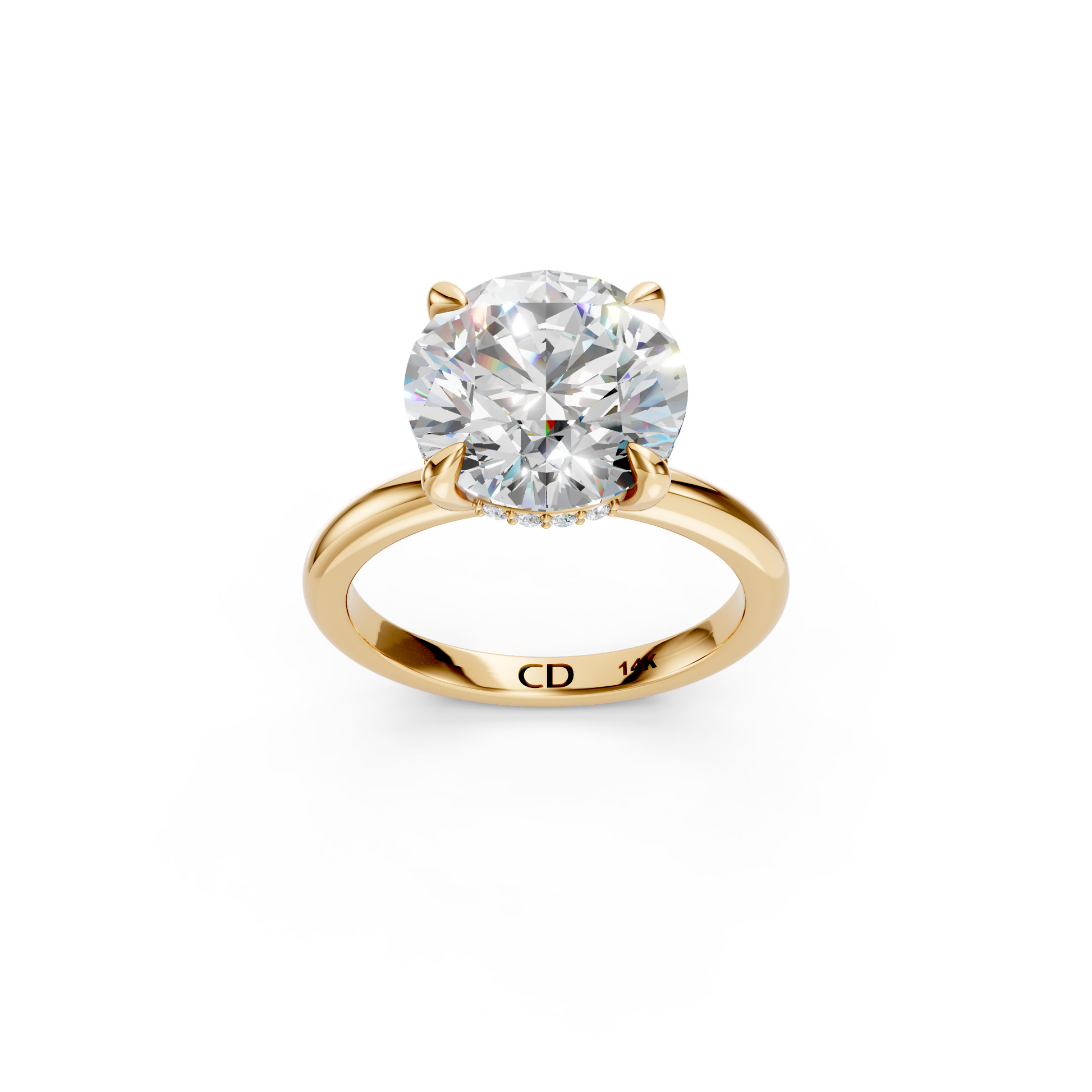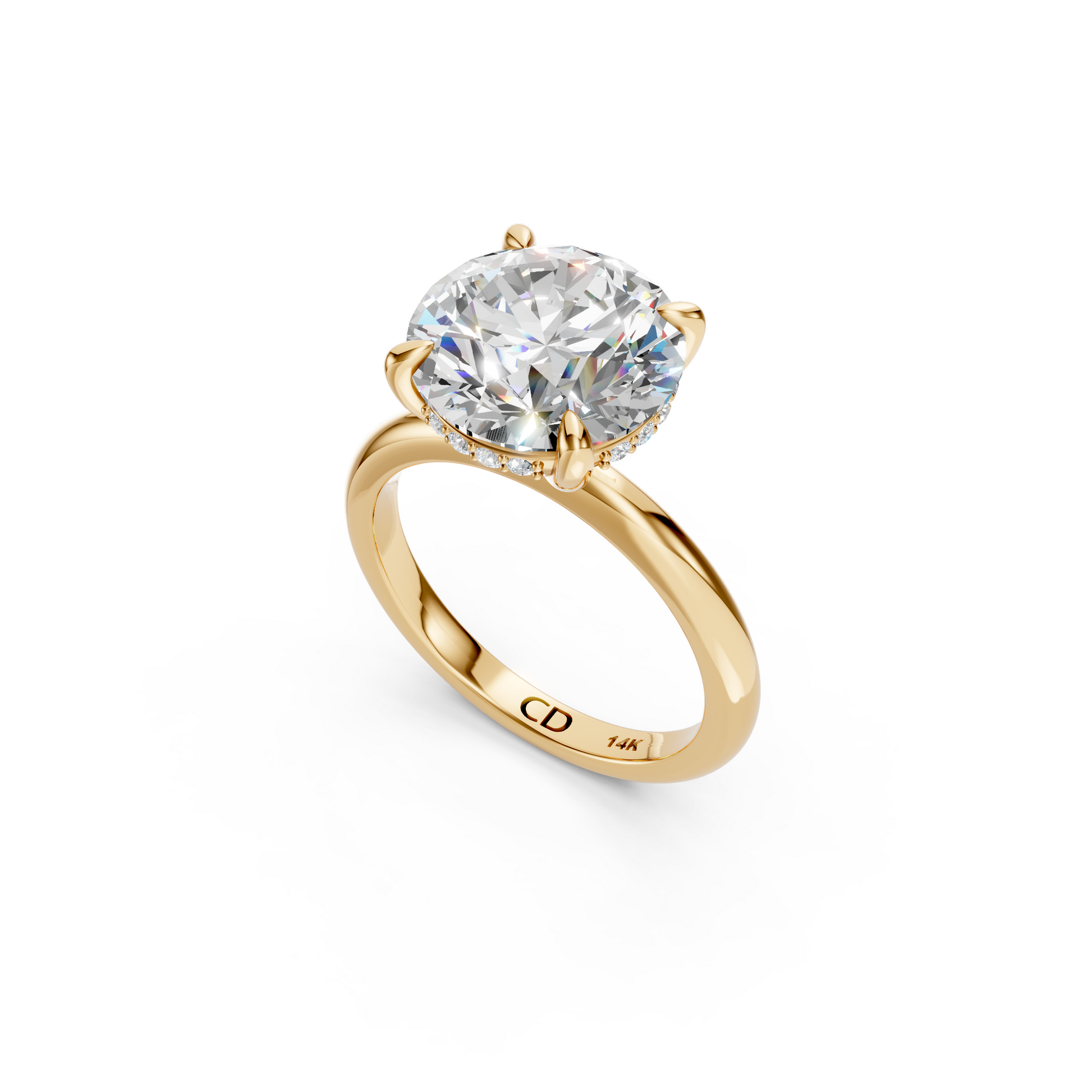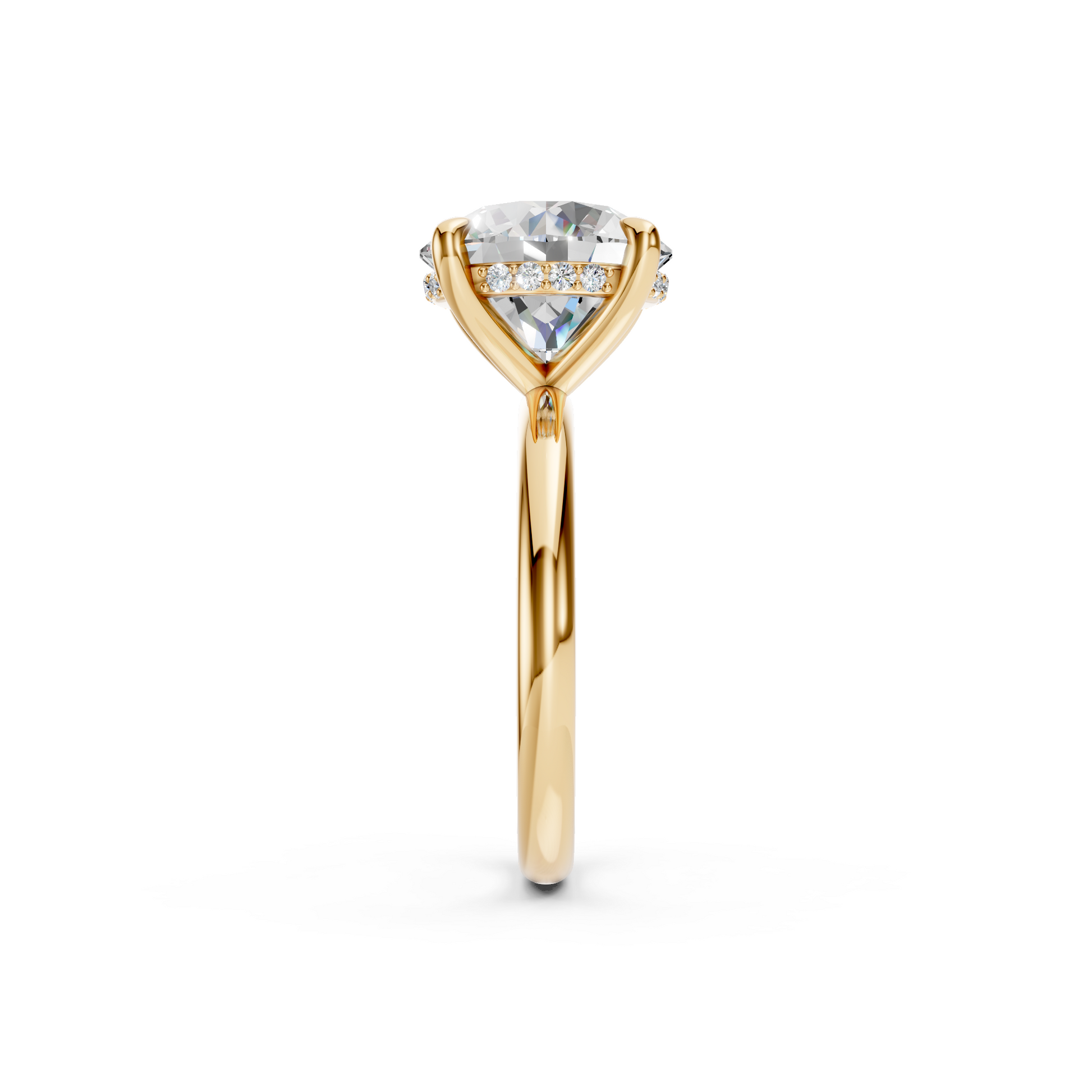 A refined solitaire with a subtle twist, this design features a smooth band and a hidden halo tucked just beneath the center stone. The result is a timeless silhouette from the top with an unexpected burst of brilliance when viewed from the side.