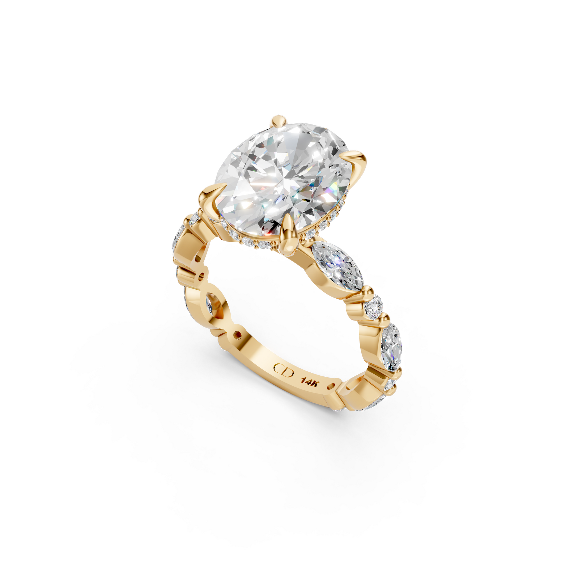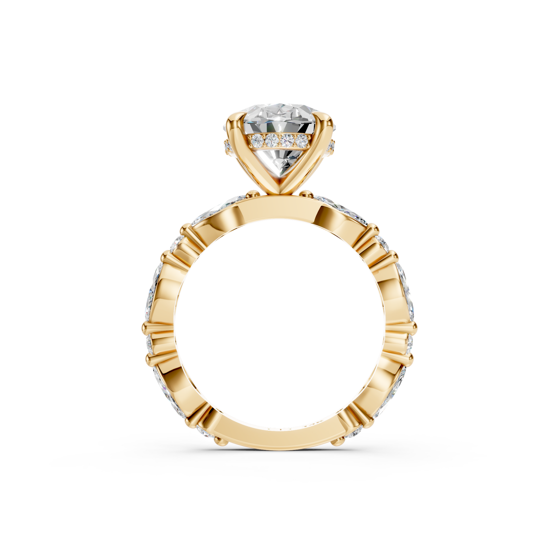 The Versailles Setting showcases a beautifully sculpted band with alternating marquise and round accents that catch the light from every angle. A hidden halo sits just beneath the center stone, adding a soft, radiant shimmer. Loved by many for its balance of elegance and artistry.